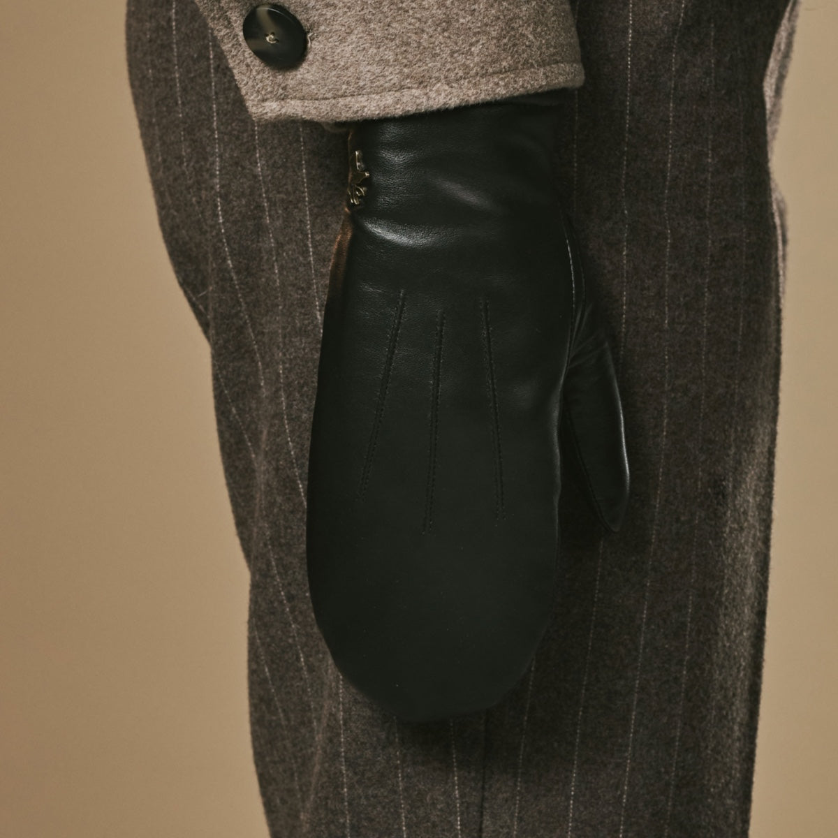 Megan (black) - Women’s lambskin leather mittens with rabbit fur lining and touchscreen feature