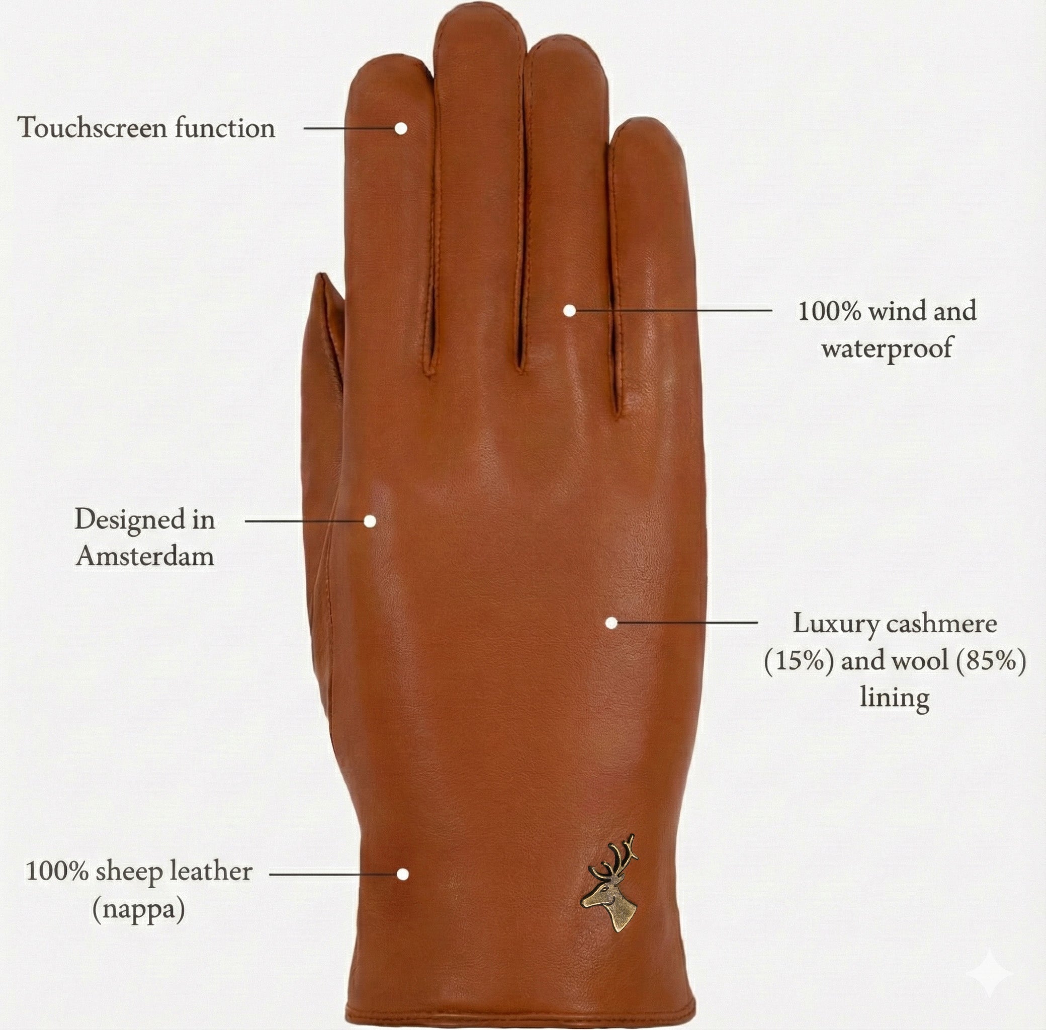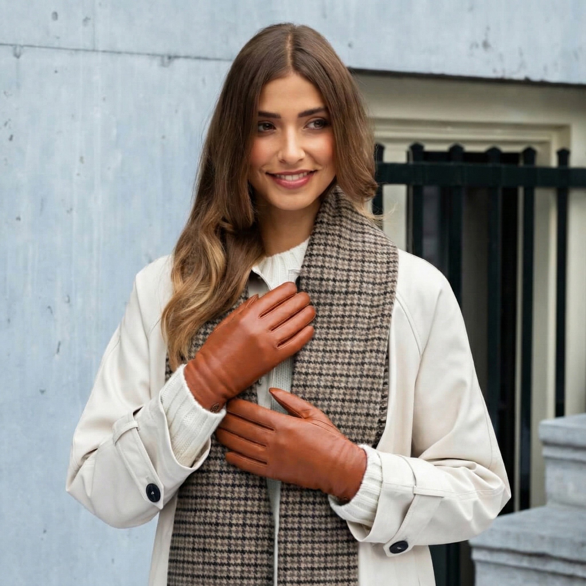 Ivy (cognac) - Sheepskin leather gloves with wool/cashmere lining & touchscreen feature